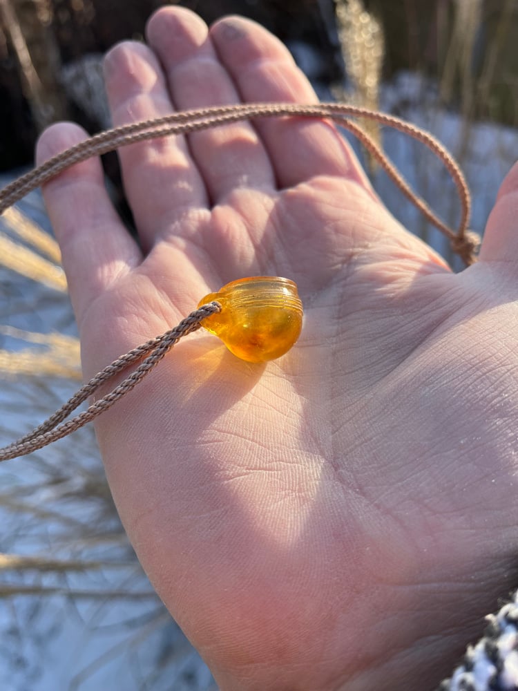 A delightful miniature of the Hove Amber cup. Carved from Baltic Amber this tiny replica is hung on a handwoven rope cord.